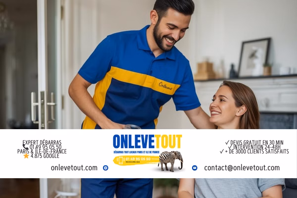 3 options : 1. Téléphone 01 49 95 05 50 (lun-sam 7h-20h, dim 9h-18h). 2. WhatsApp 01 83 64 43 45 (photos + description). 3. Formulaire onlevetout.com/devis-en-ligne. Expert sur place sous 24h. Devis gratuit, valable 30 jours.
