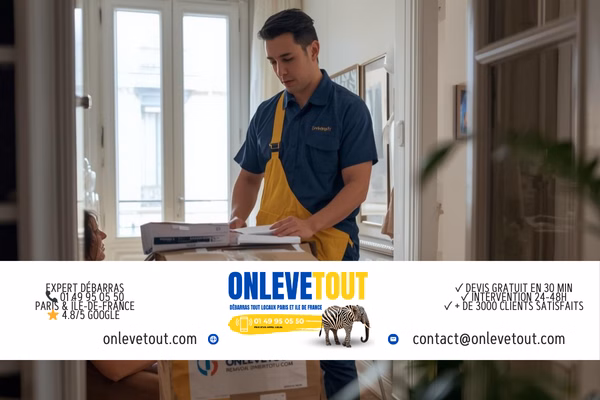 3 options : 1. Téléphone 01 49 95 05 50 (lun-sam 7h-20h, dim 9h-18h). 2. WhatsApp 01 83 64 43 45 (photos + description). 3. Formulaire onlevetout.com/devis-en-ligne. Expert sur place sous 24h. Devis gratuit, valable 30 jours.