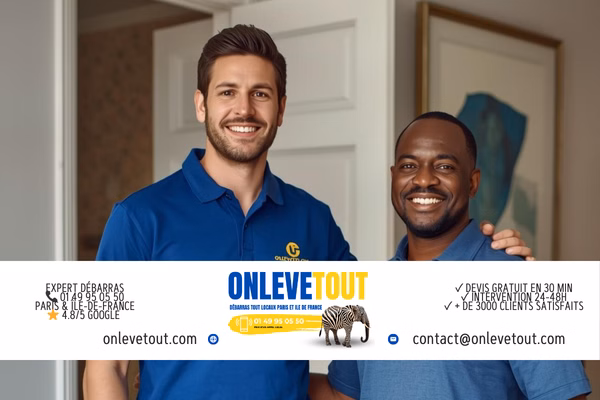 3 options : 1. Téléphone 01 49 95 05 50 (lun-sam 7h-20h, dim 9h-18h). 2. WhatsApp 01 83 64 43 45 (photos + description). 3. Formulaire onlevetout.com/devis-en-ligne. Expert sur place sous 24h. Devis gratuit, valable 30 jours.