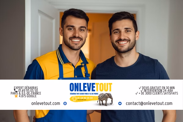 3 options : 1. Téléphone 01 49 95 05 50 (lun-sam 7h-20h, dim 9h-18h). 2. WhatsApp 01 83 64 43 45 (photos + description). 3. Formulaire onlevetout.com/devis-en-ligne. Expert sur place sous 24h. Devis gratuit, valable 30 jours.