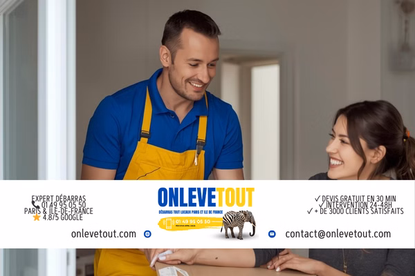3 options : 1. Téléphone 01 49 95 05 50 (lun-sam 7h-20h, dim 9h-18h). 2. WhatsApp 01 83 64 43 45 (photos + description). 3. Formulaire onlevetout.com/devis-en-ligne. Expert sur place sous 24h. Devis gratuit, valable 30 jours.