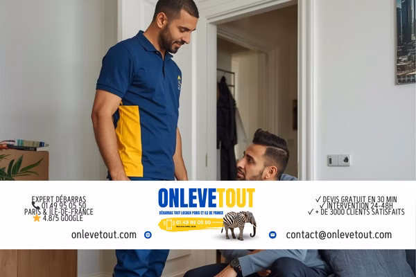 3 options : 1. Téléphone 01 49 95 05 50 (lun-sam 7h-20h, dim 9h-18h). 2. WhatsApp 01 83 64 43 45 (photos + description). 3. Formulaire onlevetout.com/devis-en-ligne. Expert sur place sous 24h. Devis gratuit, valable 30 jours.